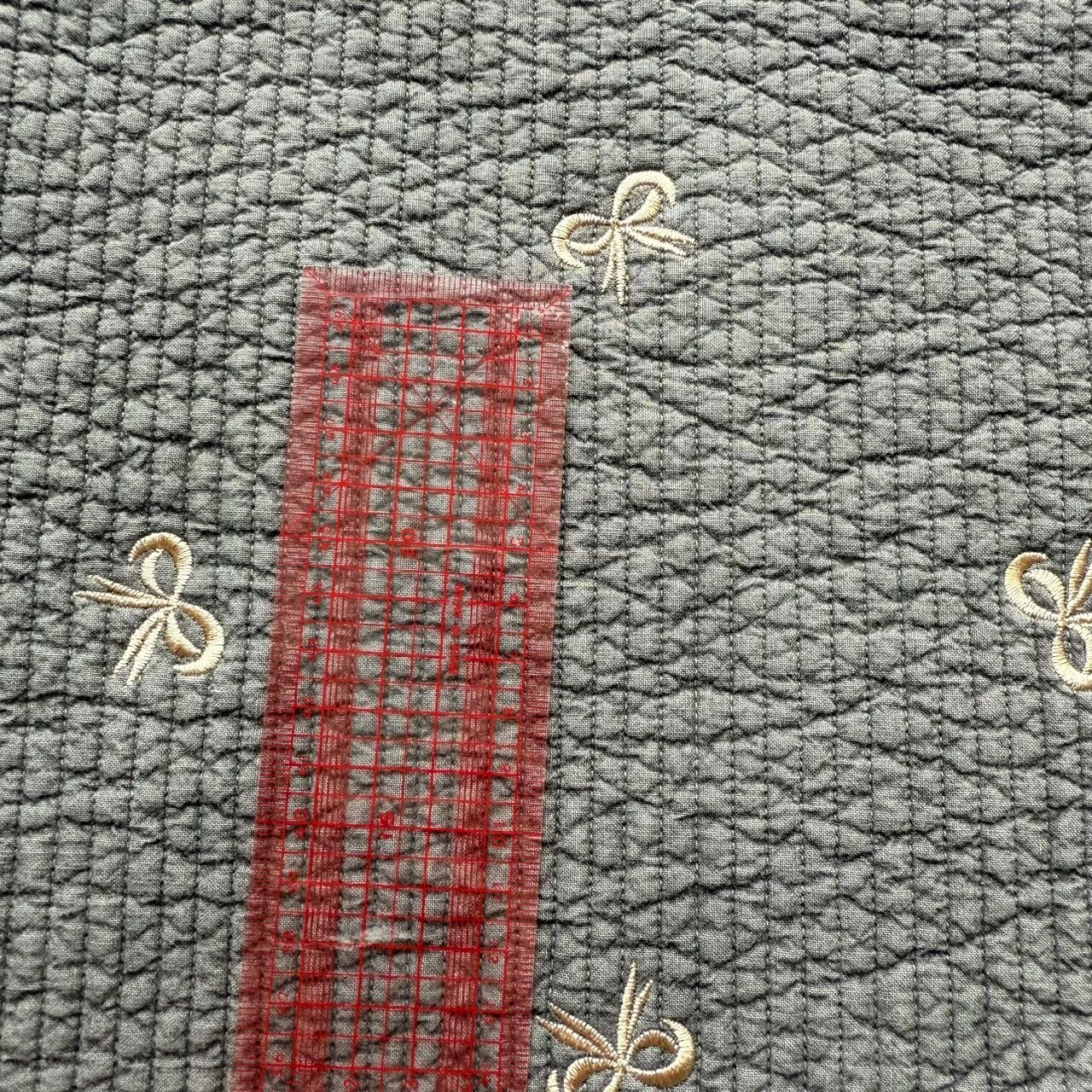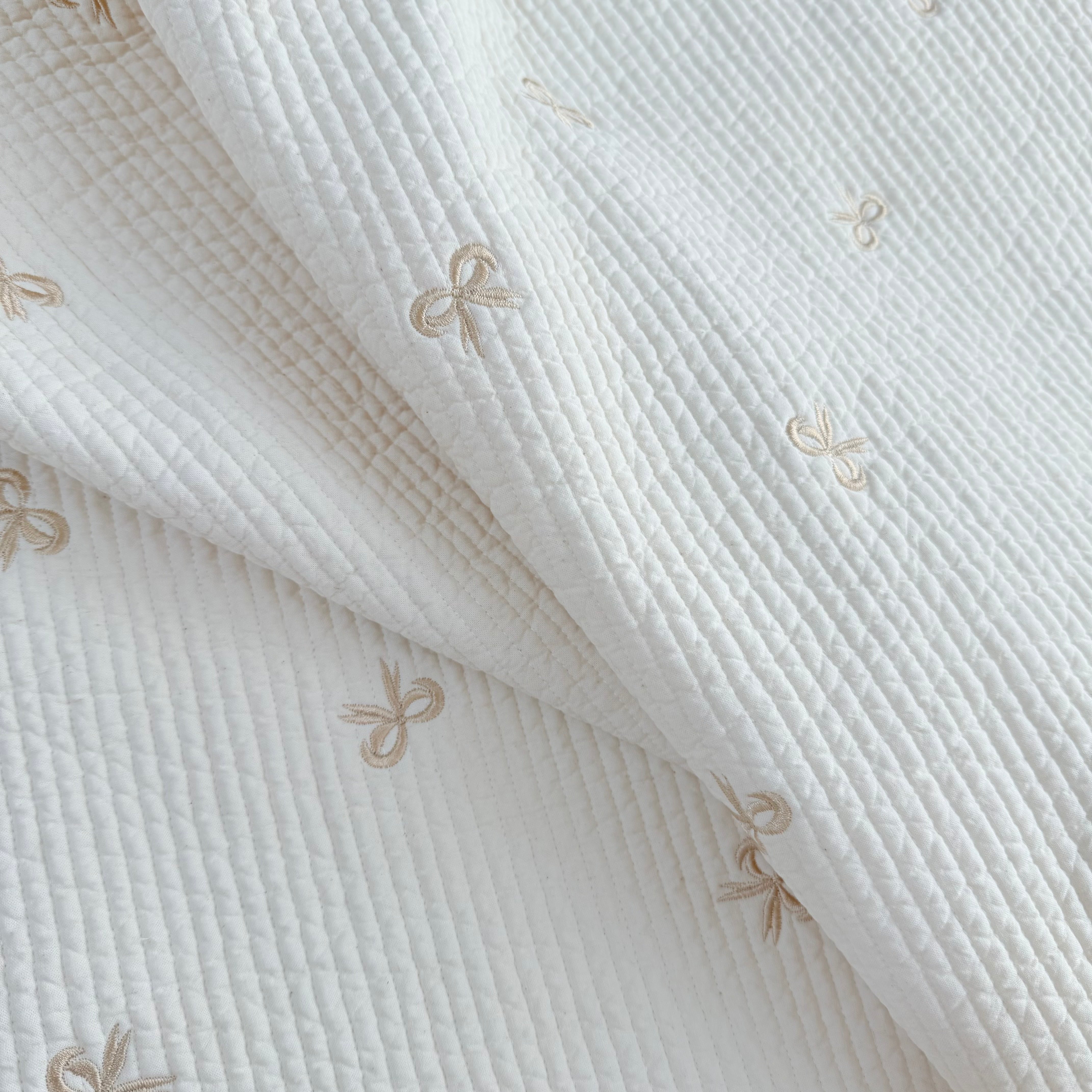 ラテ色のリボンが刺繍された上品で可愛い生地ができました!